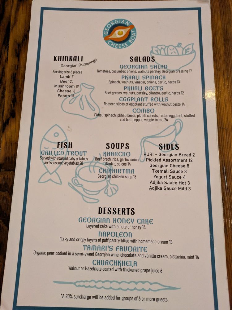 “ First time trying Georgian food and it did not disappoint. This place is a small mom and pop shop and I almost missed it, but I saw the cheese boat as a menu outside and had to try it. To my surprise- it's better than you're thinking :) my party and I ordered a couple things - Georgian dumplings, sausage and potatoes, and a variety of the cheese boats. The waiter was kind to show us how to eat the dumplings the right way. Everything was so delicious and breaks my heart I'm too far away to come back regularly. If you are in the area, definitely check the place out- I recommend the dumplings and the cheese boat! 10/10 ”